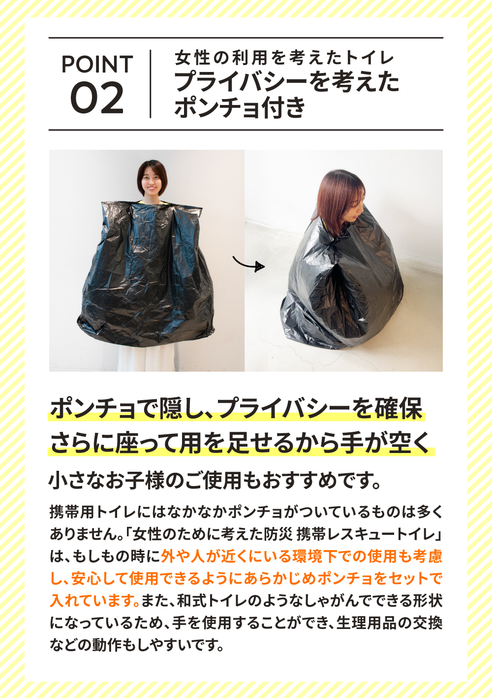 ●プライバシーを守るポンチョ付き:屋外や人目のある場所でも安心して使用できるよう、身体を覆うポンチョをセット。周囲から見えにくく、女性のプライバシーをしっかり確保します。